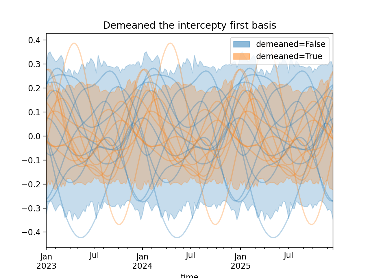 import numpy as np import pandas as pd import xarray as xr import matplotlib.pyplot as plt from pymc_marketing.mmm import HSGPPeriodic from pymc_marketing.plot import plot_curve seed = sum(map(ord, "Periodic GP")) rng = np.random.default_rng(seed) scale = 0.25 ls = 1 kwargs = dict(ls=ls, scale=scale, period=52, cov_func="periodic", dims="time", m=20) n = 52 * 3 dates = pd.date_range("2023-01-01", periods=n, freq="W-MON") X = np.arange(n) coords = {"time": dates} hsgp = HSGPPeriodic(demeaned_basis=False, **kwargs).register_data(X) hsgp_demeaned = HSGPPeriodic(demeaned_basis=True, **kwargs).register_data(X) def sample_curve(hsgp): return hsgp.sample_prior(coords=coords, random_seed=rng)["f"] non_demeaned = sample_curve(hsgp).rename("False") demeaned = sample_curve(hsgp_demeaned).rename("True") combined = xr.merge([non_demeaned, demeaned]).to_array("demeaned") _, axes = combined.pipe(plot_curve, "time", same_axes=True) axes[0].set(title="Demeaned the intercepty first basis") plt.show()