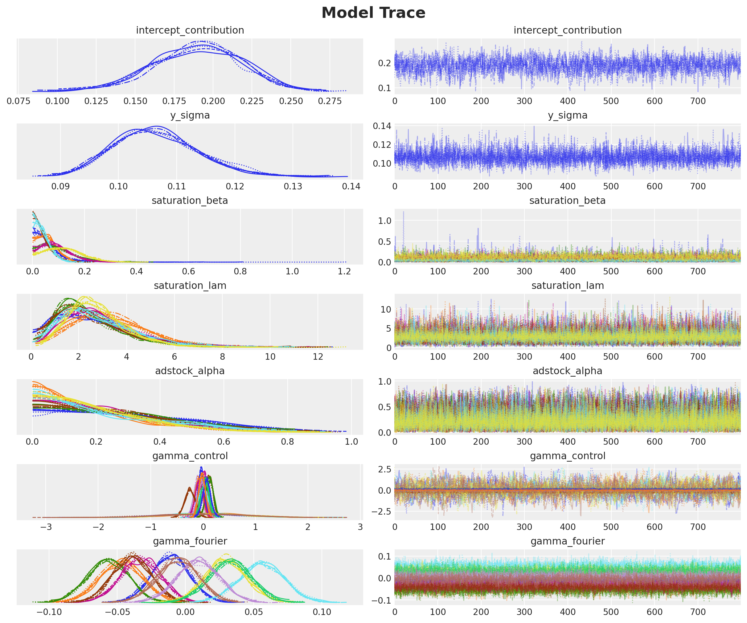 8. Explore advanced features: Investigate other PyMC-Marketing capabilities, such as incorporating time varying parameters (see MMM with time-varying parameters (TVP) and MMM with time-varying media baseline) and custom models like hierarchical levels or more complex seasonality patterns, to further refine the model (see Custom Models with MMM components).