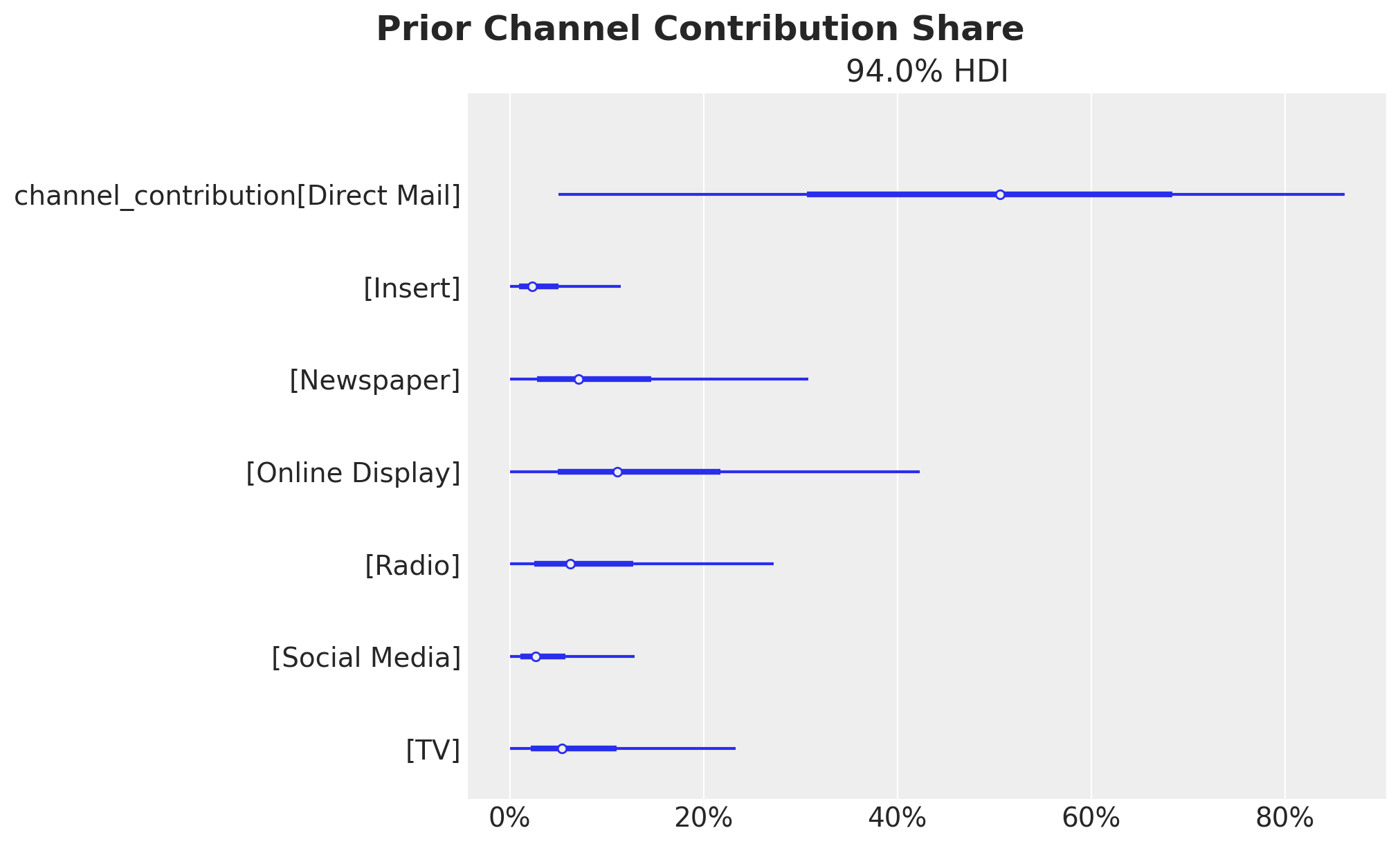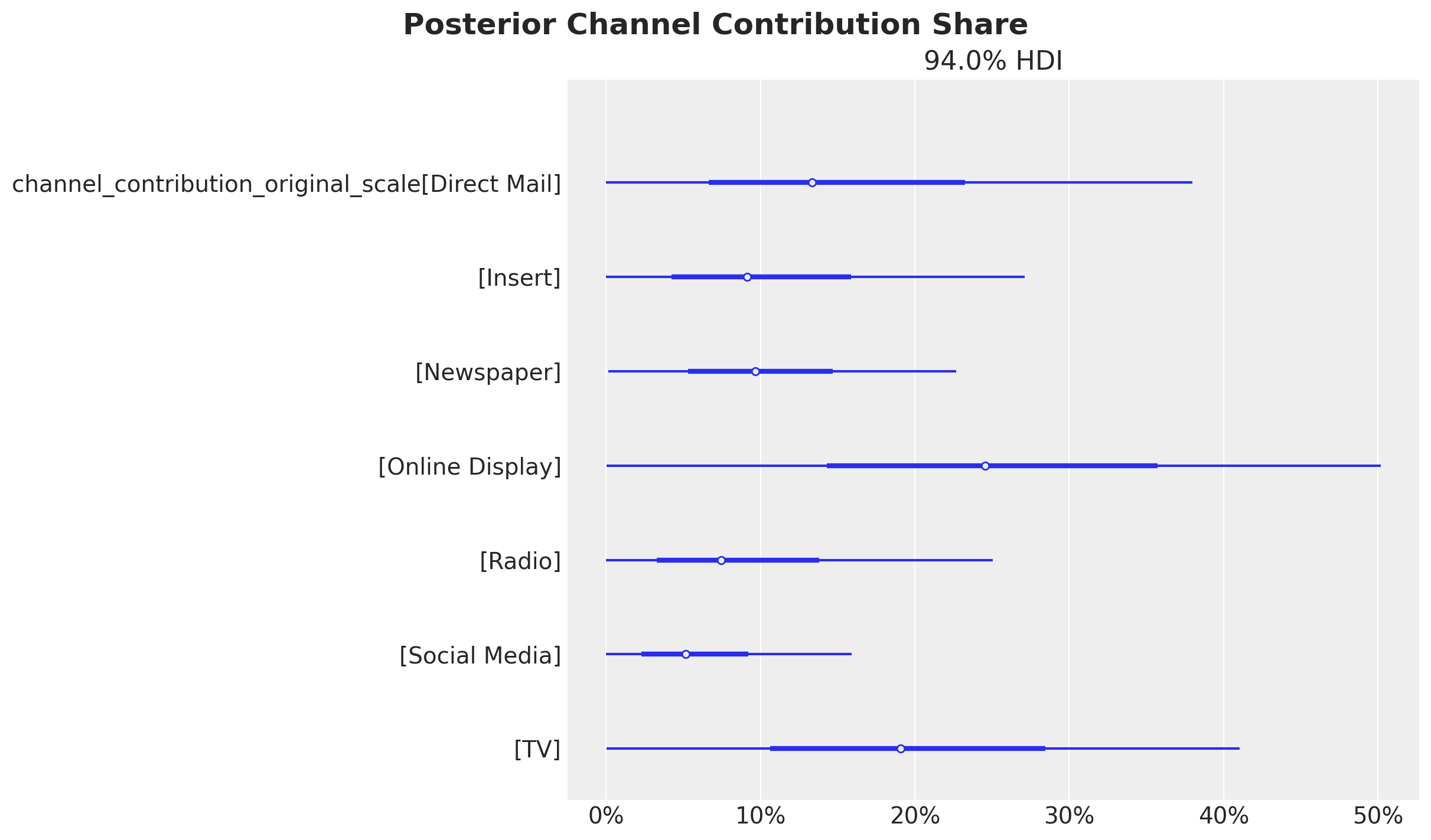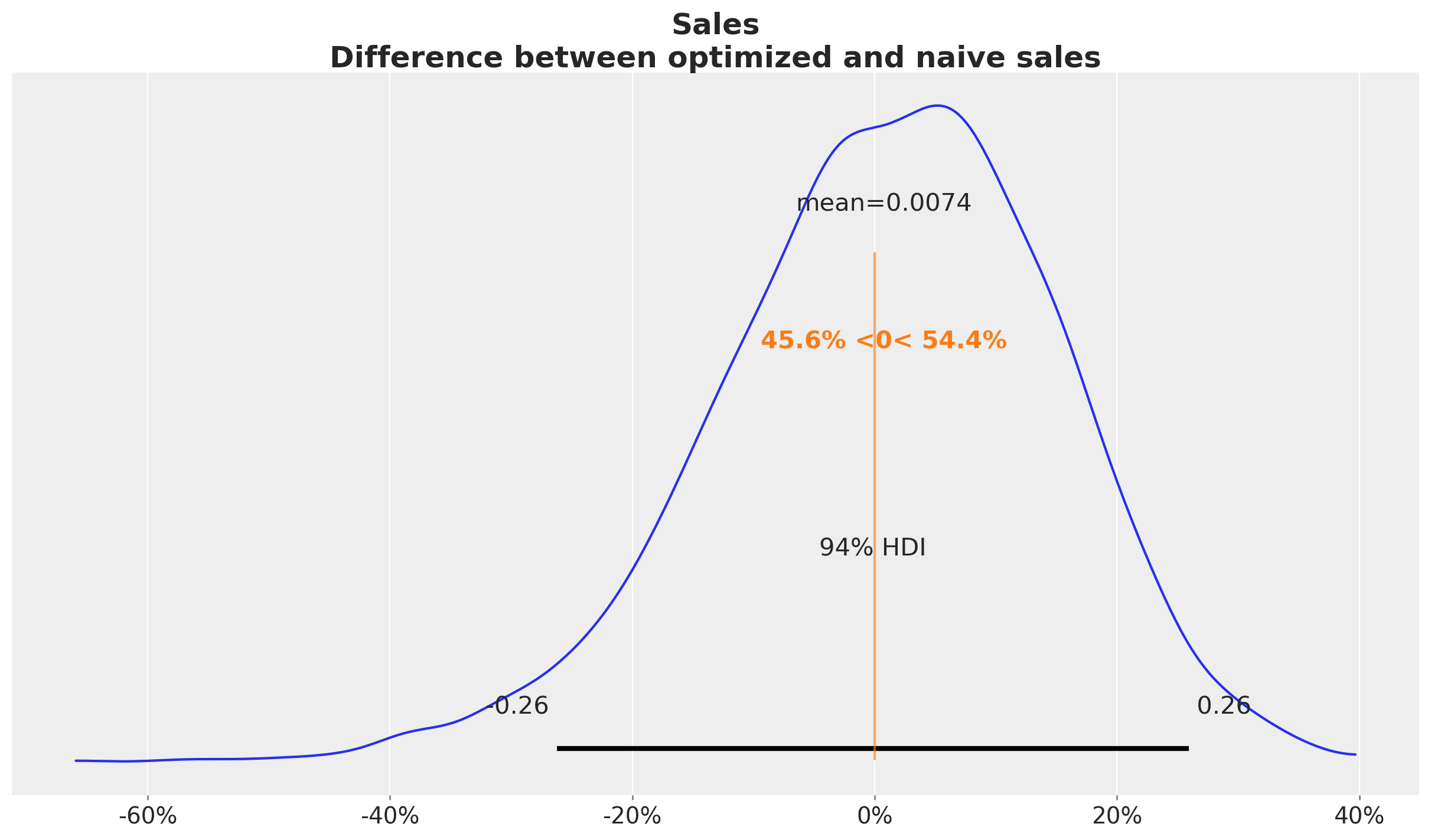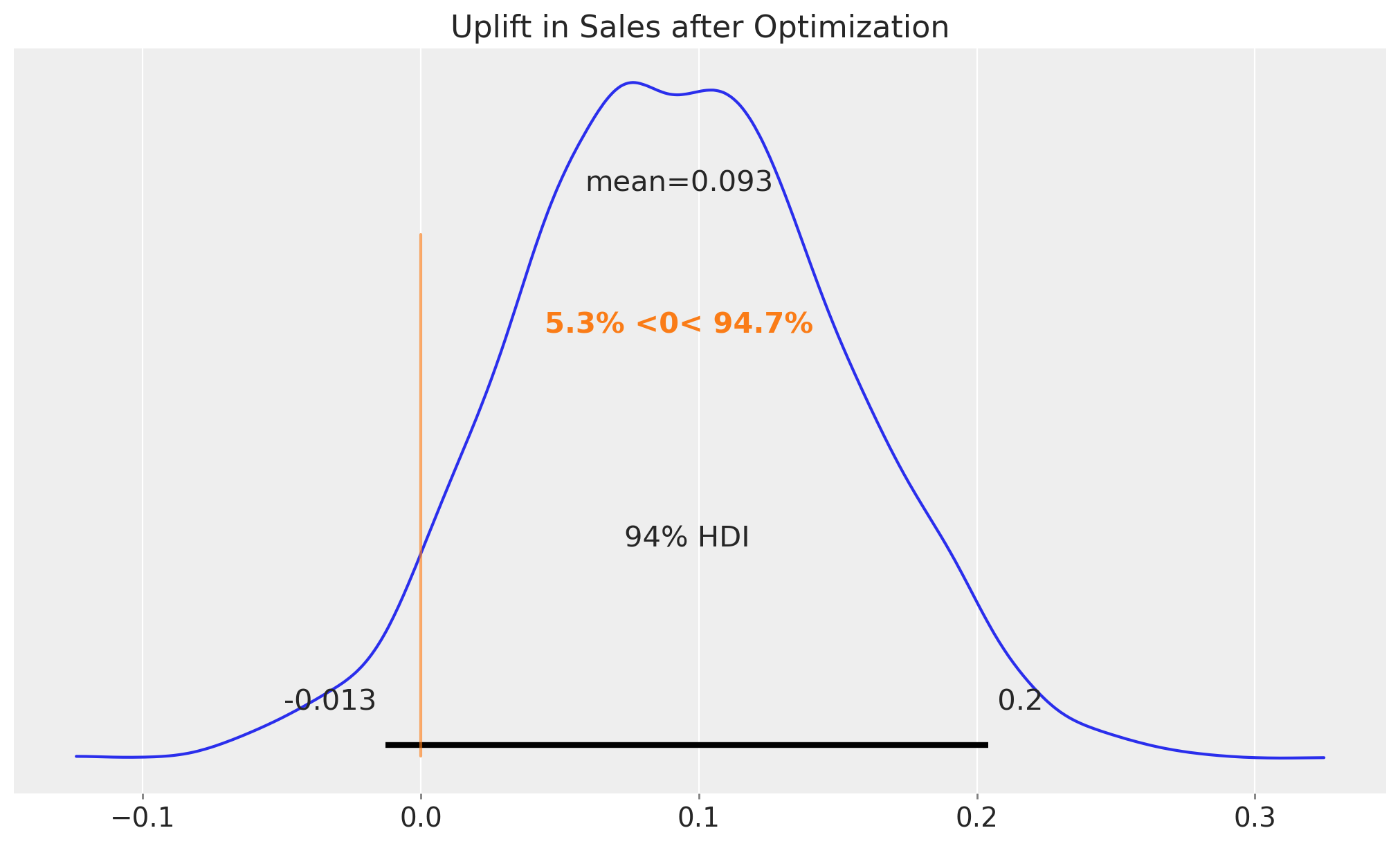 In this case we see that when we compare the posterior samples of the uplift to the reference value of zero we do not find any difference. This should not be discouraging as we did see a \(20\%\) increase in the aggregated (over time) channel contributions. This can translate to a lot of money! There is no discrepancy on the results. What we are seeing is that the constrained optimization problem where we are just allowed, because of business requirements (which is very common for many marketing teams), to change the budget up to \(50\%\) we improved the channel contributions significantly but not at the same order of magnitude of the other model components.