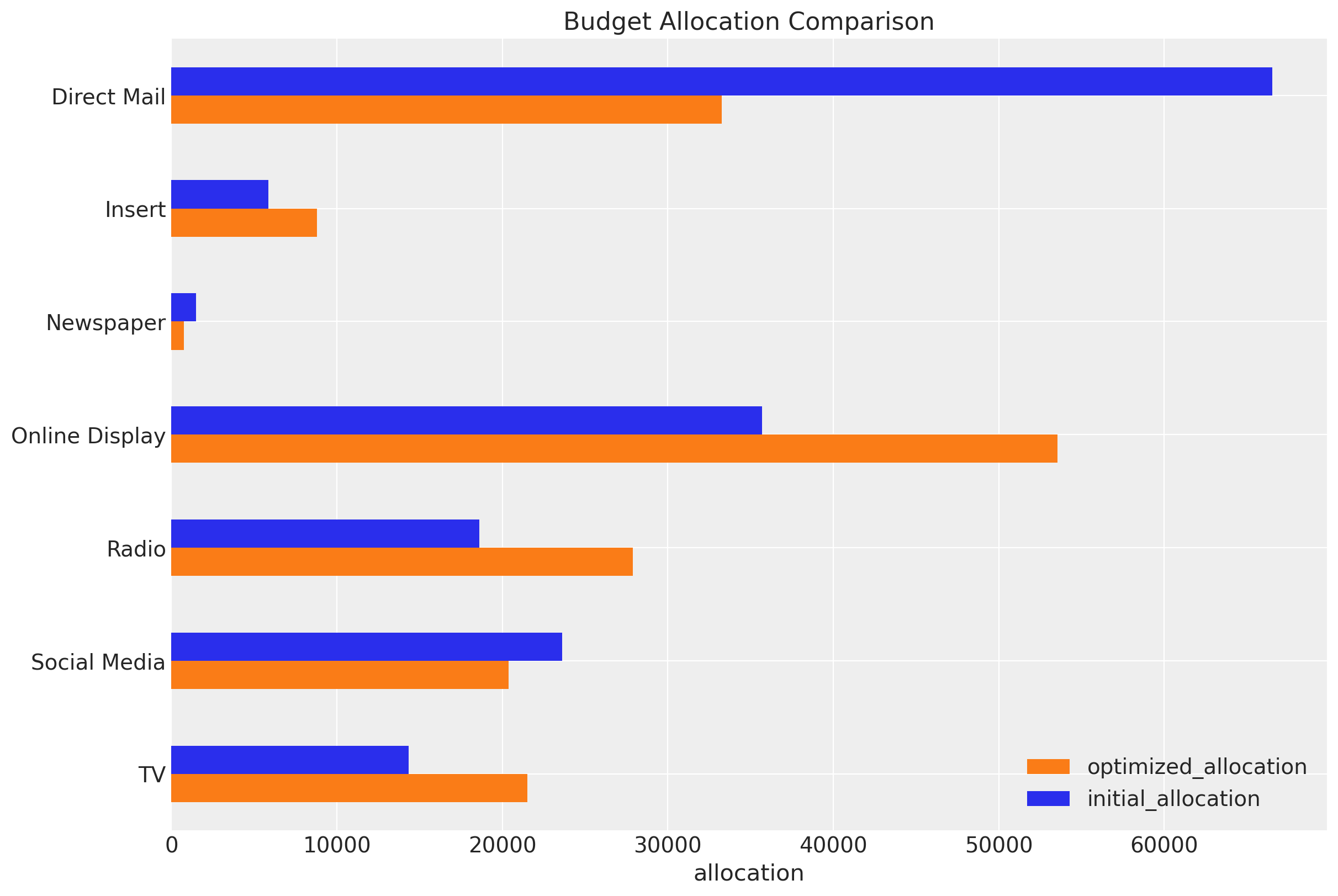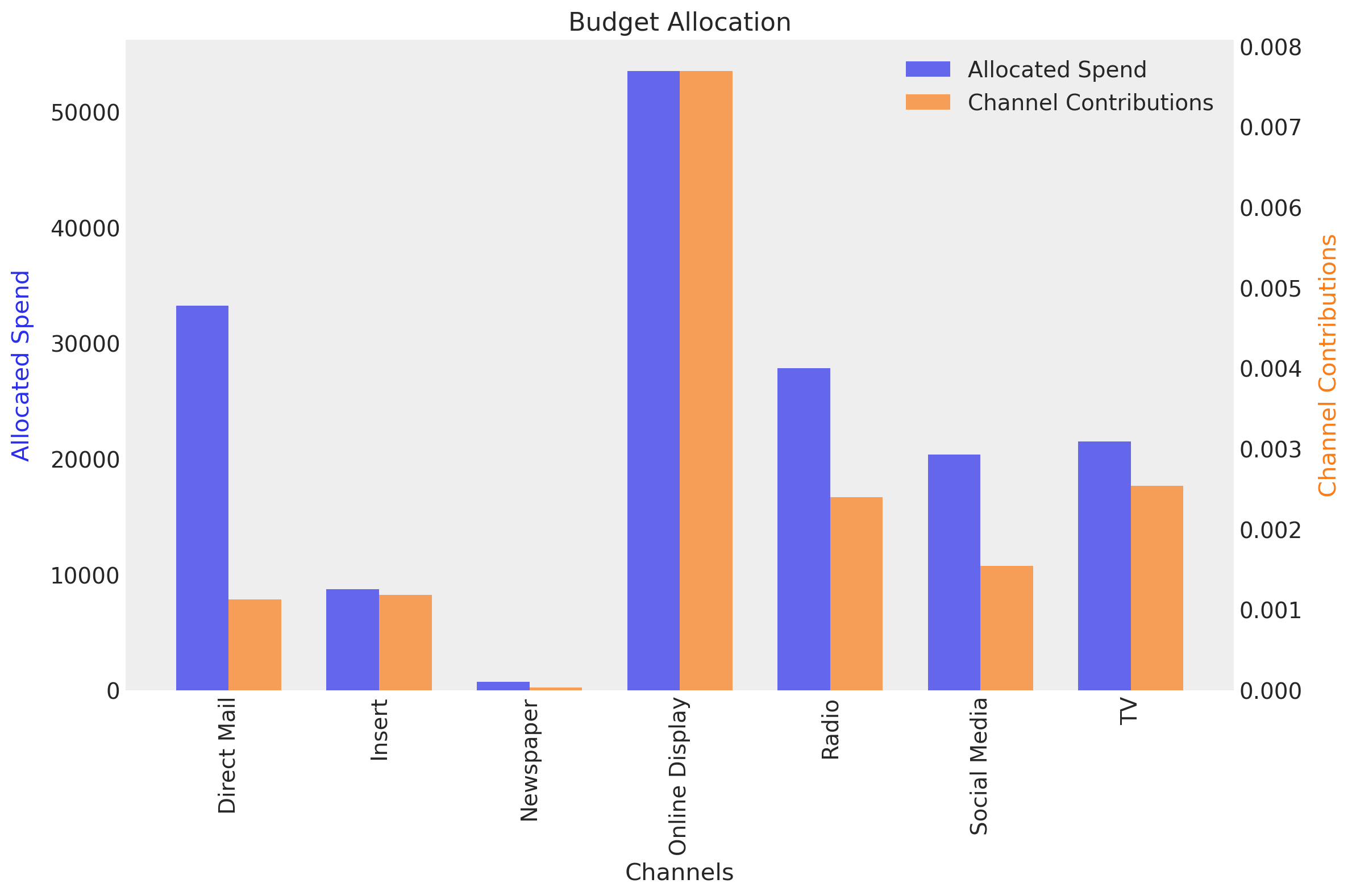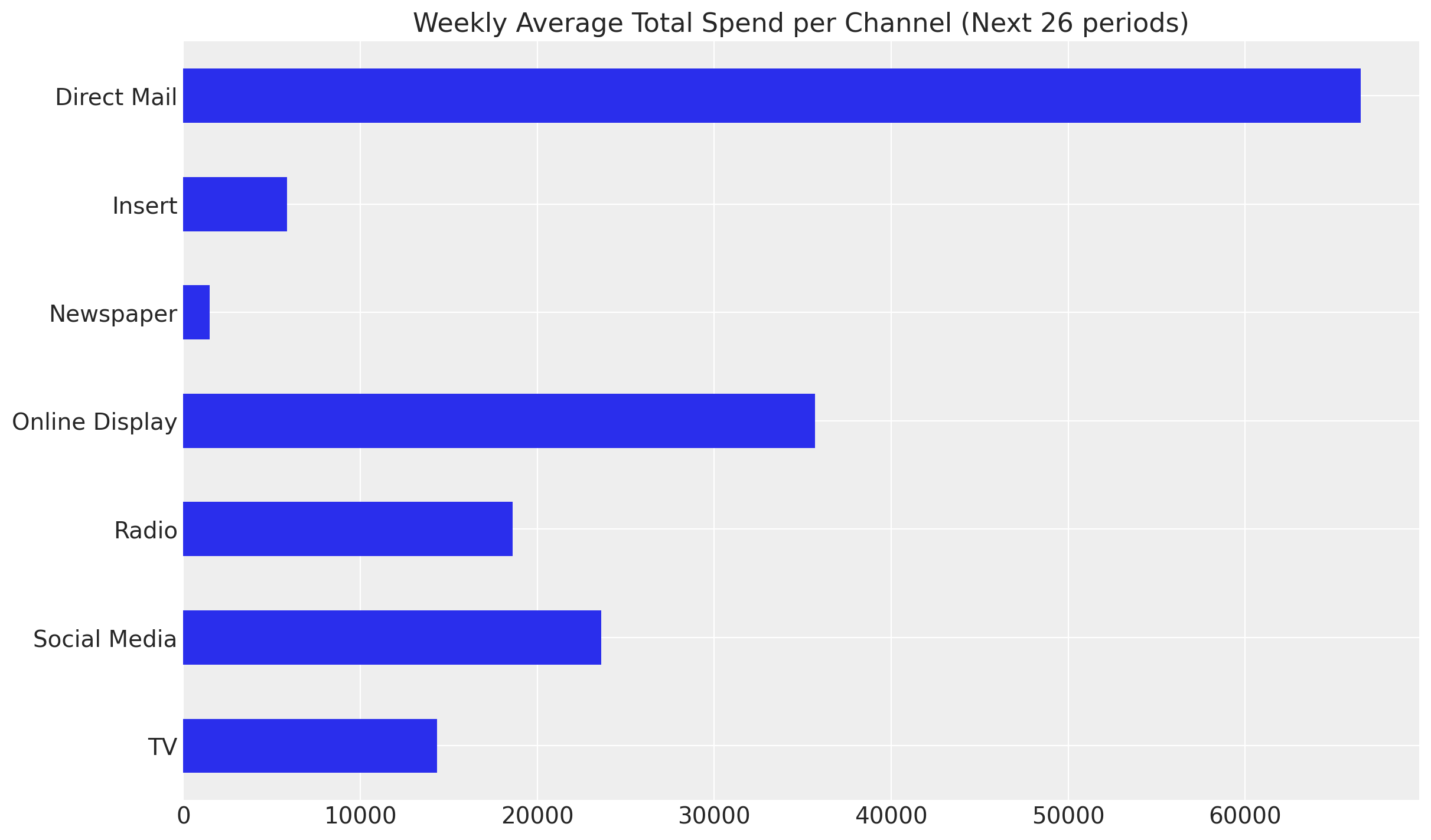 In this specific example we see that Direct Mail is the channel with the highest spend, followed by Newspaper and Online Display.
