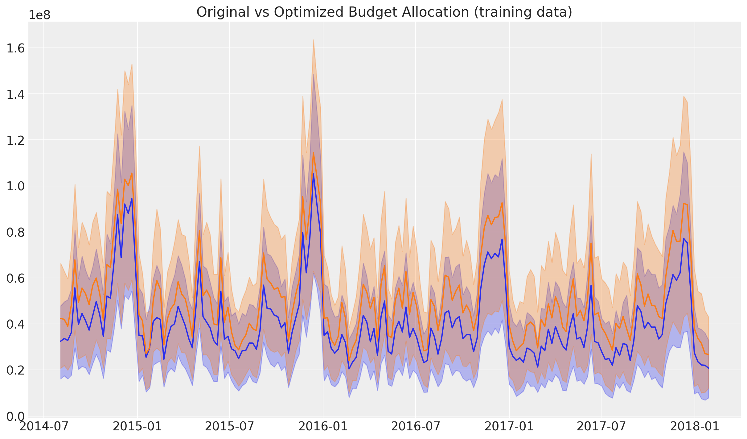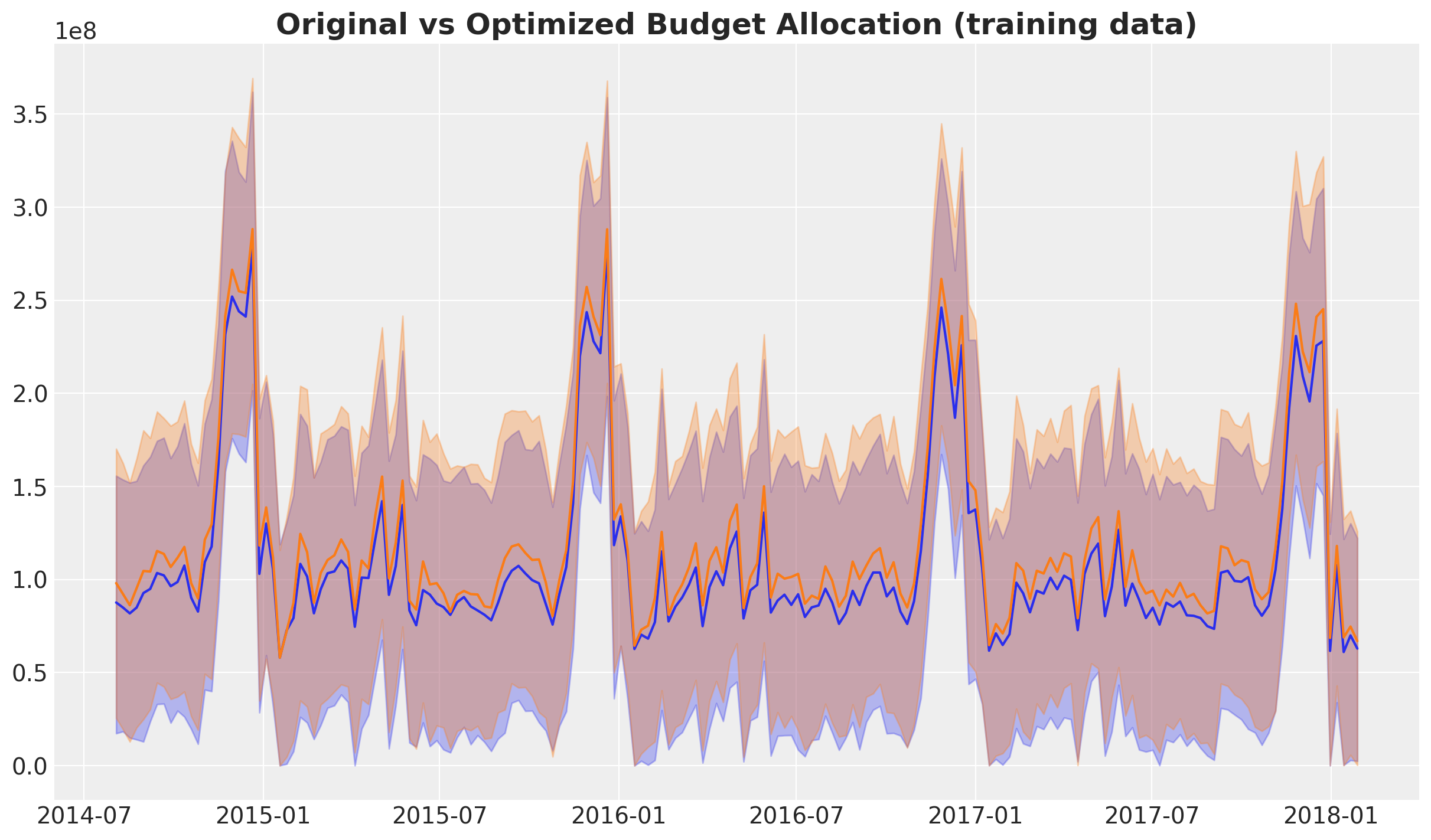 Next, we want to compare the optimized and naive total sales. The strategy is the same as in the case above. The only difference is that we add additional variables like seasonality and baseline (intercept). As mentioned above, we set the control variables to zero for the sake of comparison. This is what is done in the allocate_budget_to_maximize_response() method.