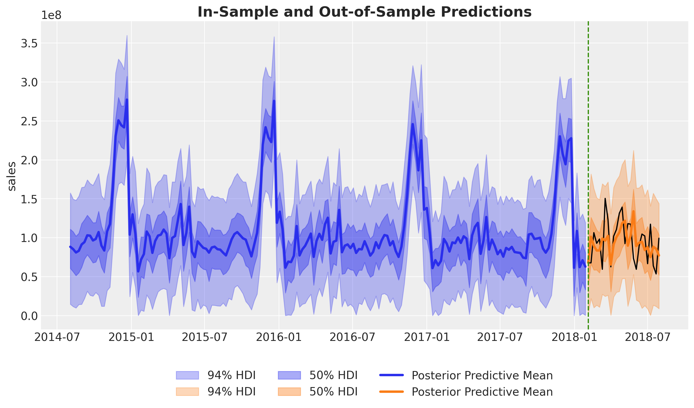 At the level of total sales, in this case the difference is negligible as the baseline and seasonality (which are the same in both cases) explain most of the variance as the average weekly media spend in this last period is much smaller as in the training set.