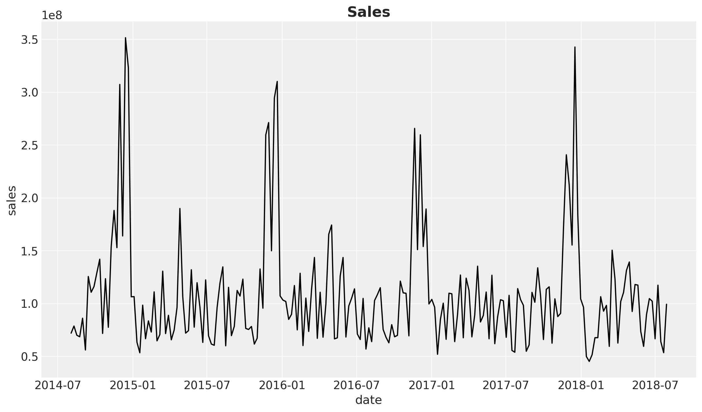 We should always start looking at the data! We can start by plotting the target variable, i.e. the sales.
