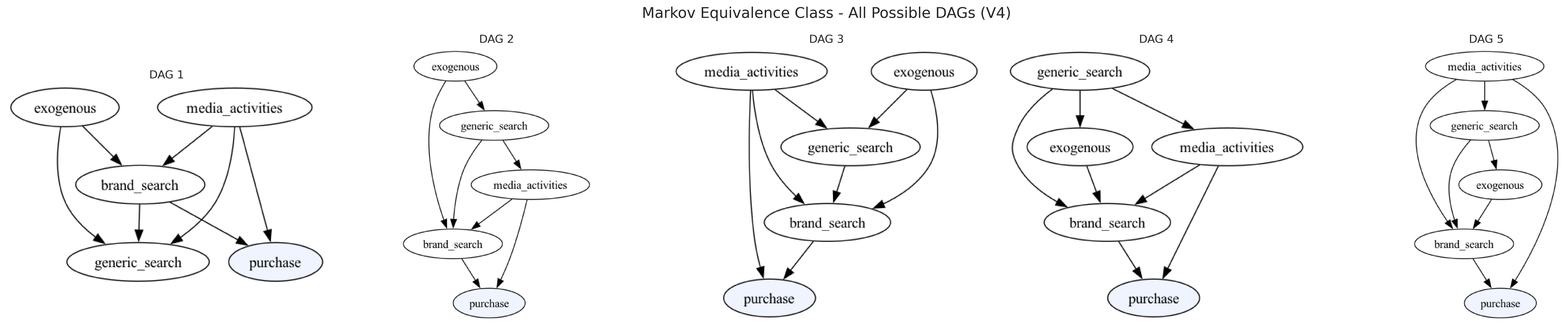 A Causal DAG represents a single, fully oriented data-generating structure where every edge has a direction (e.g., media_activities → brand_search → purchase). It encodes a complete causal story.