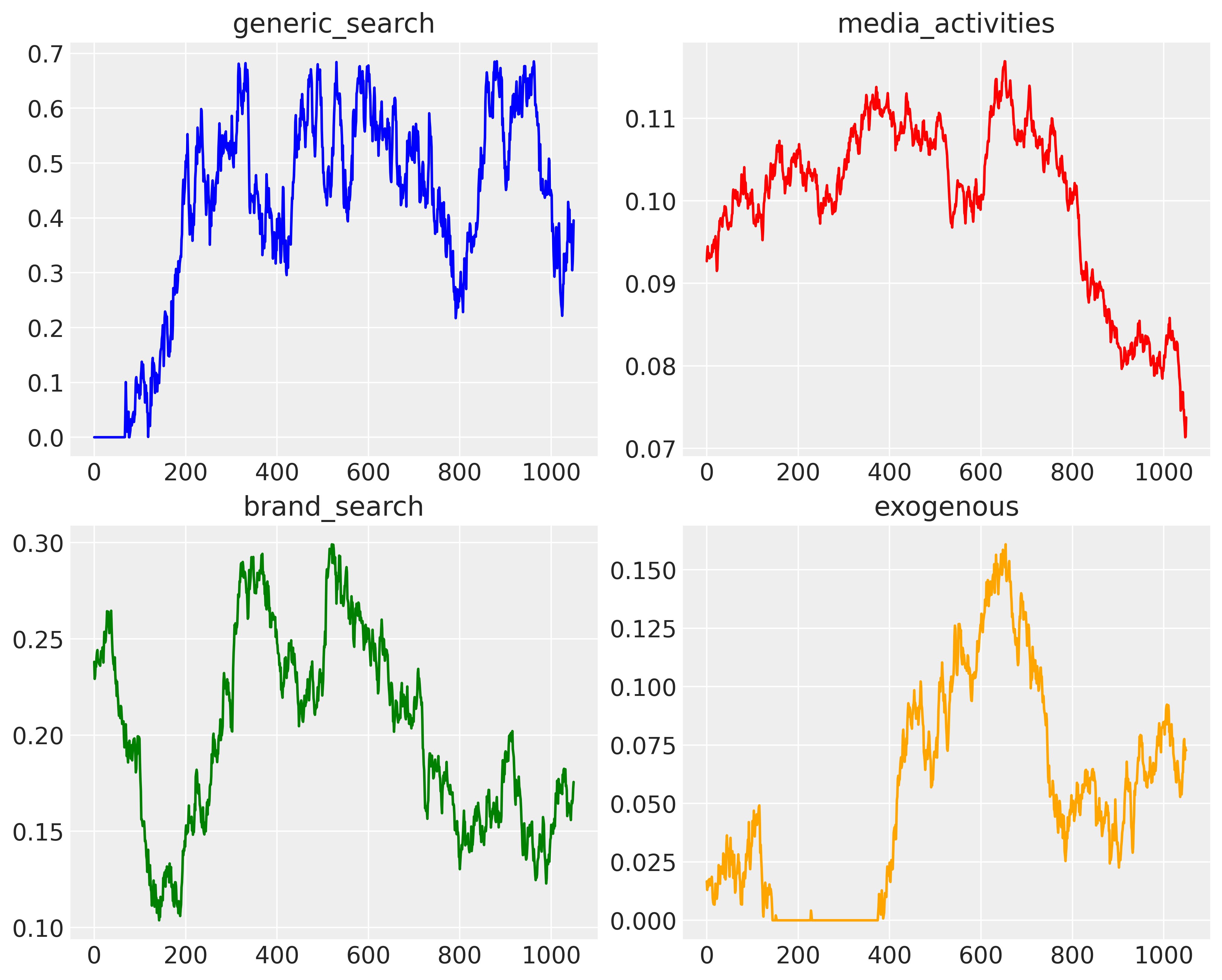 NUTS: [exogenous_intercept, exogenous_sigma, generic_search_intercept, generic_search_sigma, generic_search:brand_search, brand_search_intercept, brand_search_sigma, brand_search:media_activities, generic_search:media_activities, media_activities_intercept, media_activities_sigma, brand_search:purchase, exogenous:purchase, media_activities:purchase, purchase_intercept, purchase_sigma]